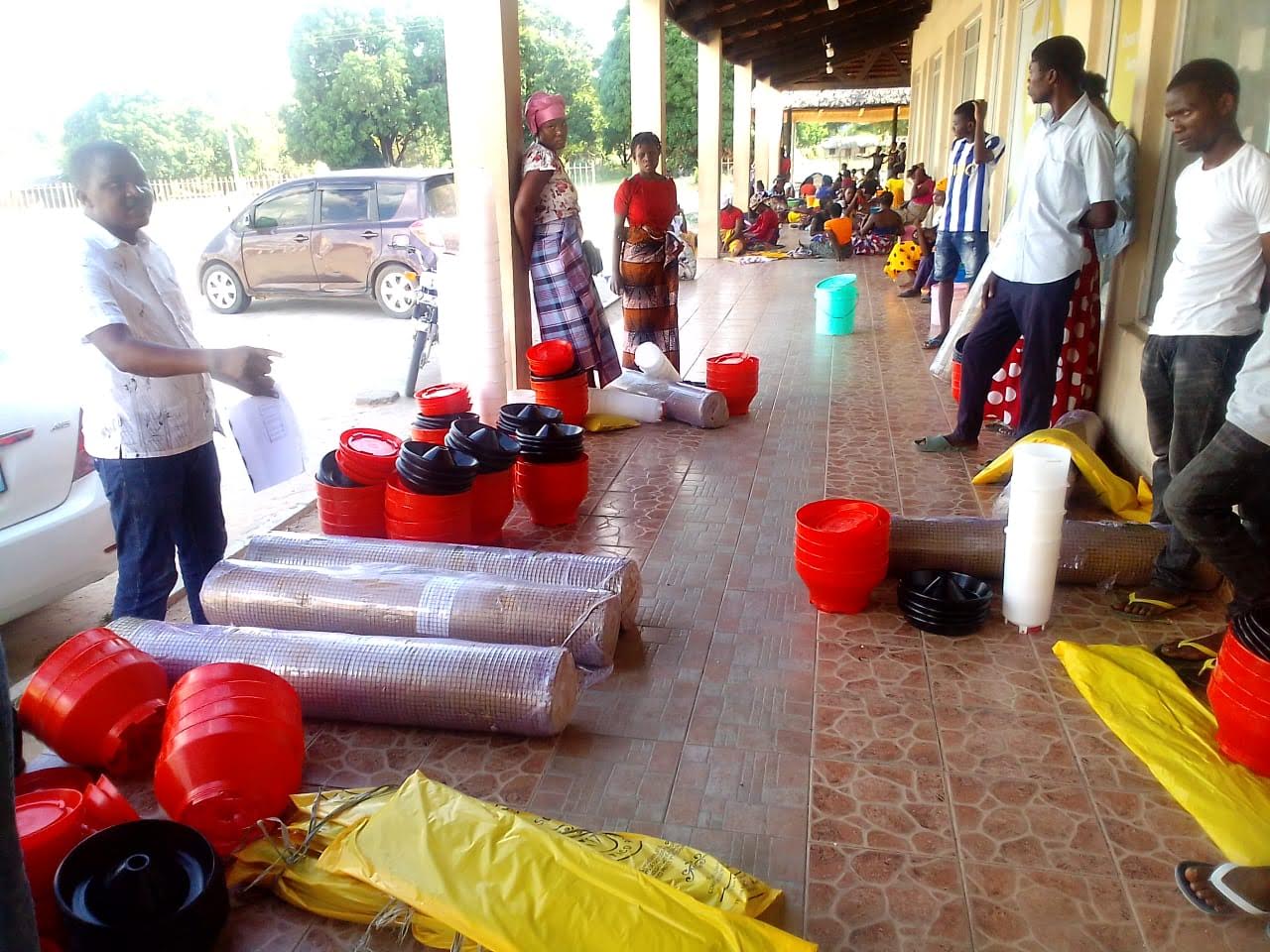 Momento em que fazia-se a distribuição de material (Redes e plástico) de construção de pavilhões a base de material local, comedores, bebedores e insumos (Ração, Pintos, Antibióticos e Vitaminas), para a criação de frango de corte; no âmbito do projecto de criação actividades de geração de renda no seio dos Jovens ao nível do Distrito de Rapale, na Província de Nampula. Trata-se de um projecto desenvolvido em parceria com a PWW, GIZ, Novos Horizontes e Associação Ebenezer.